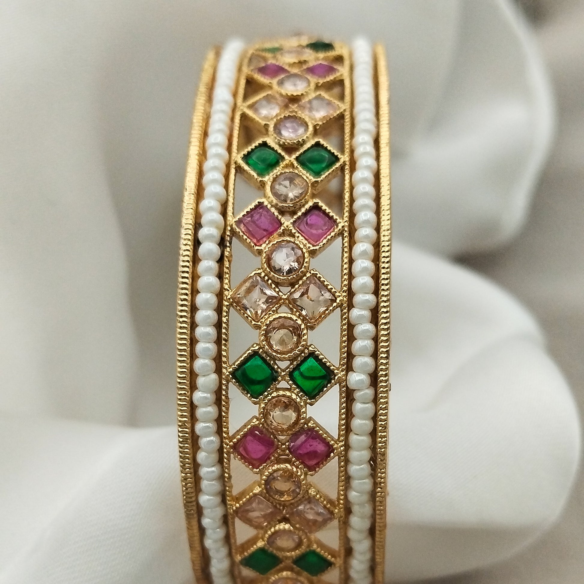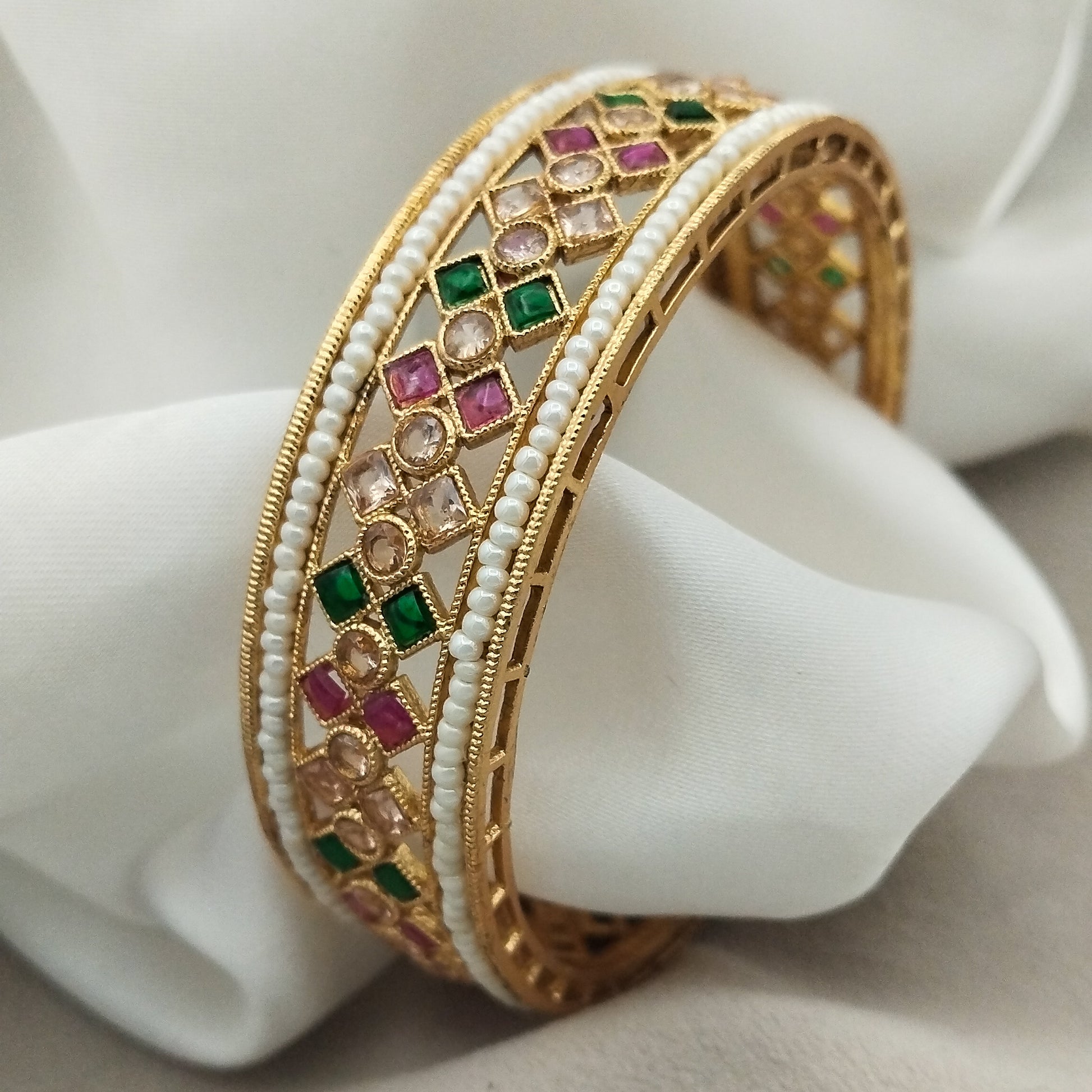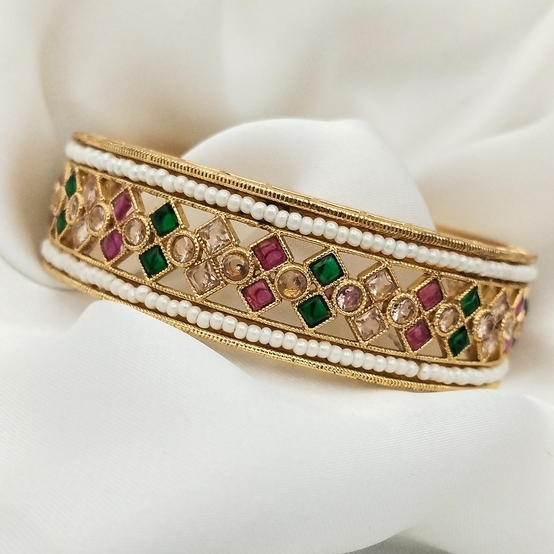Inspired by regal opulence, this bangle celebrates love, passion, and timeless beauty. The delicate white pearls and red stones rest like treasures in a royal courtyard — a statement of grace for every festive moment.