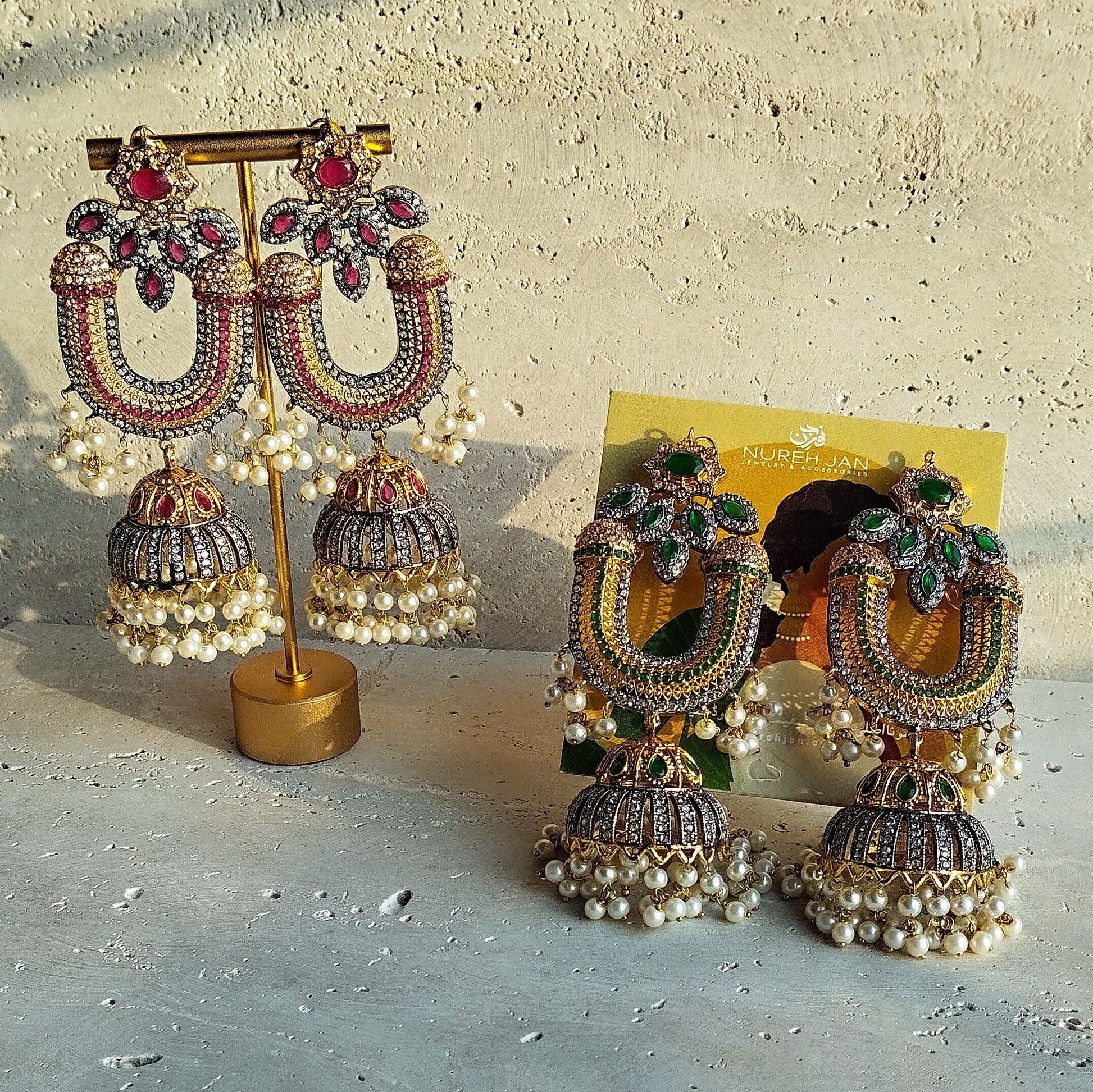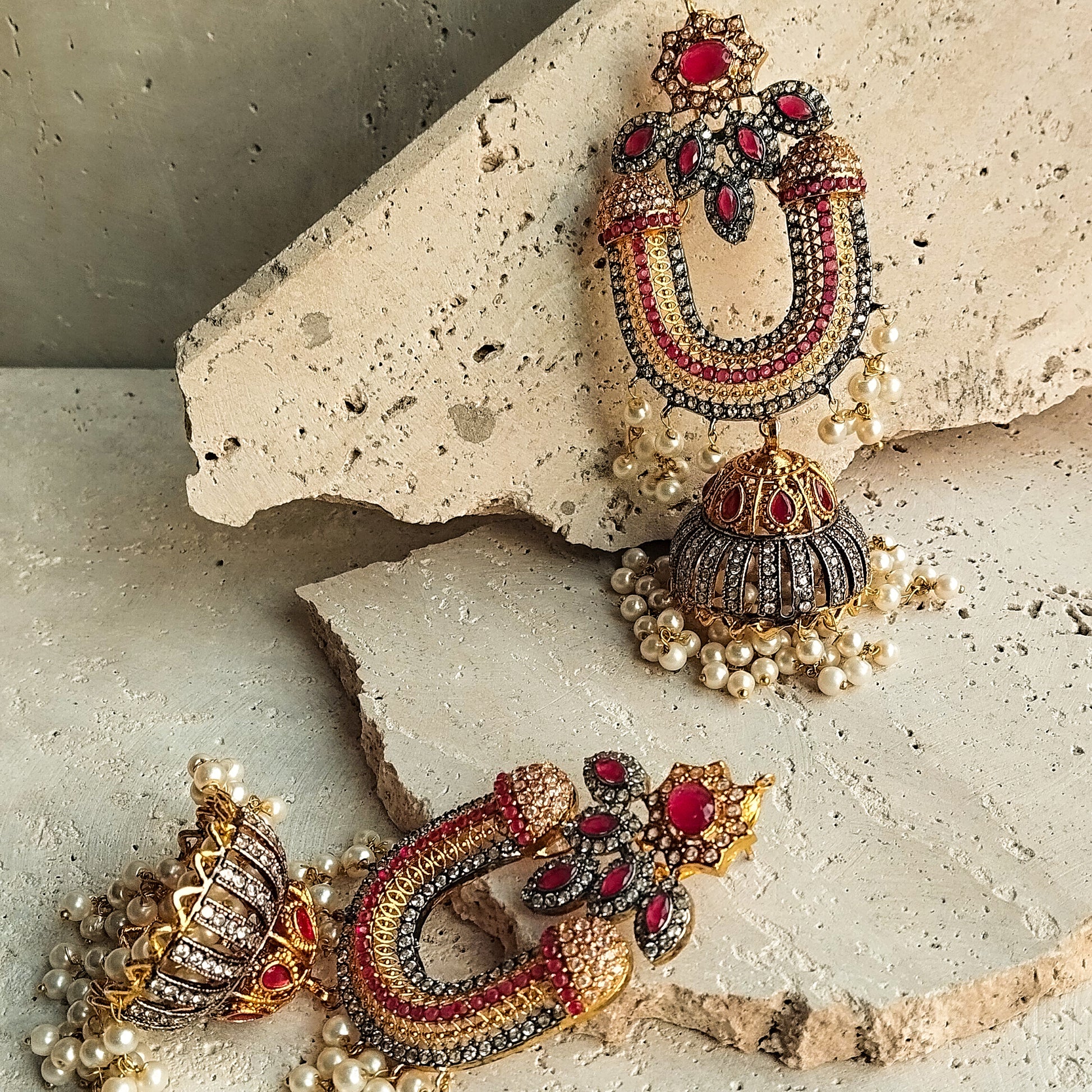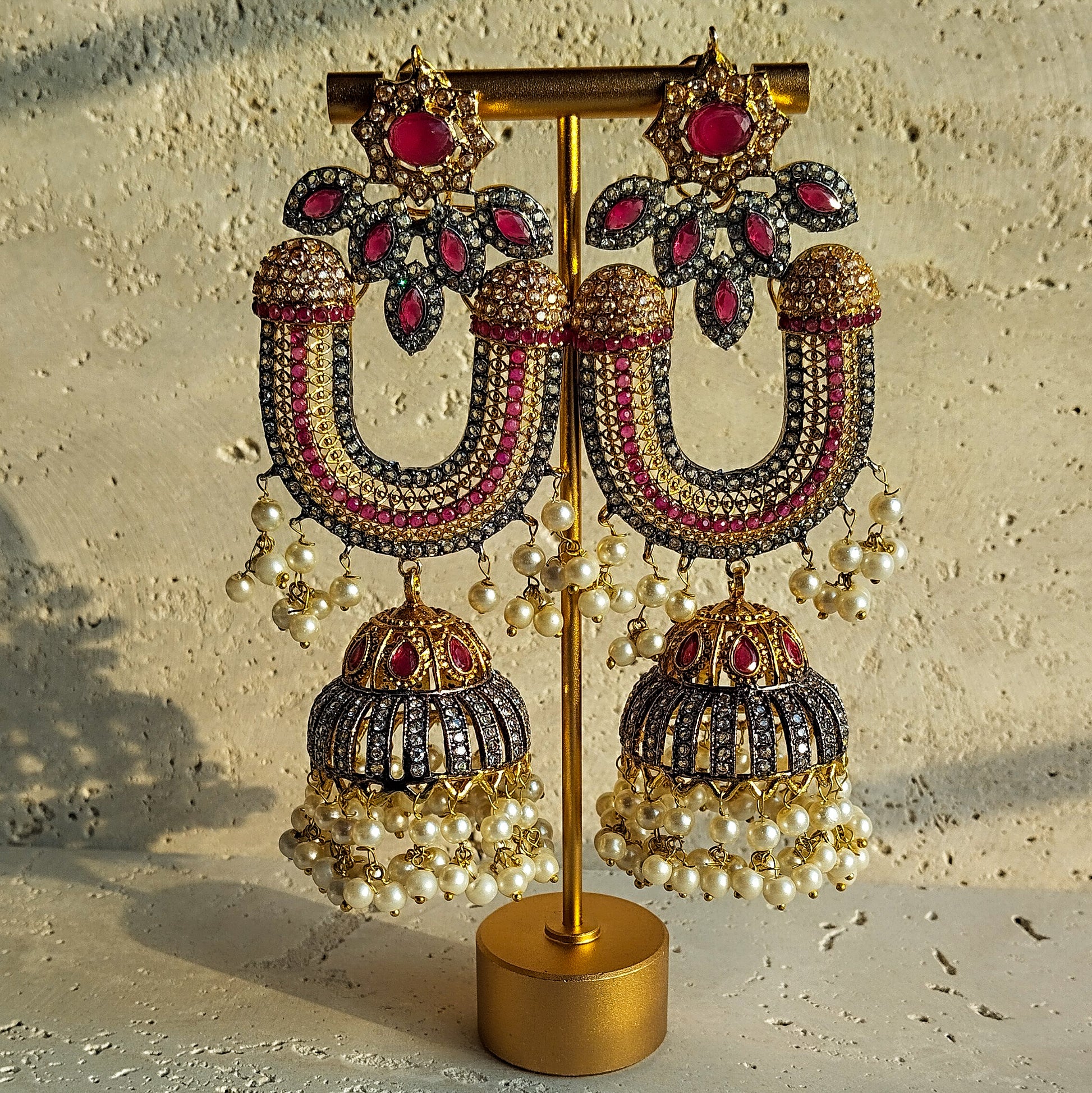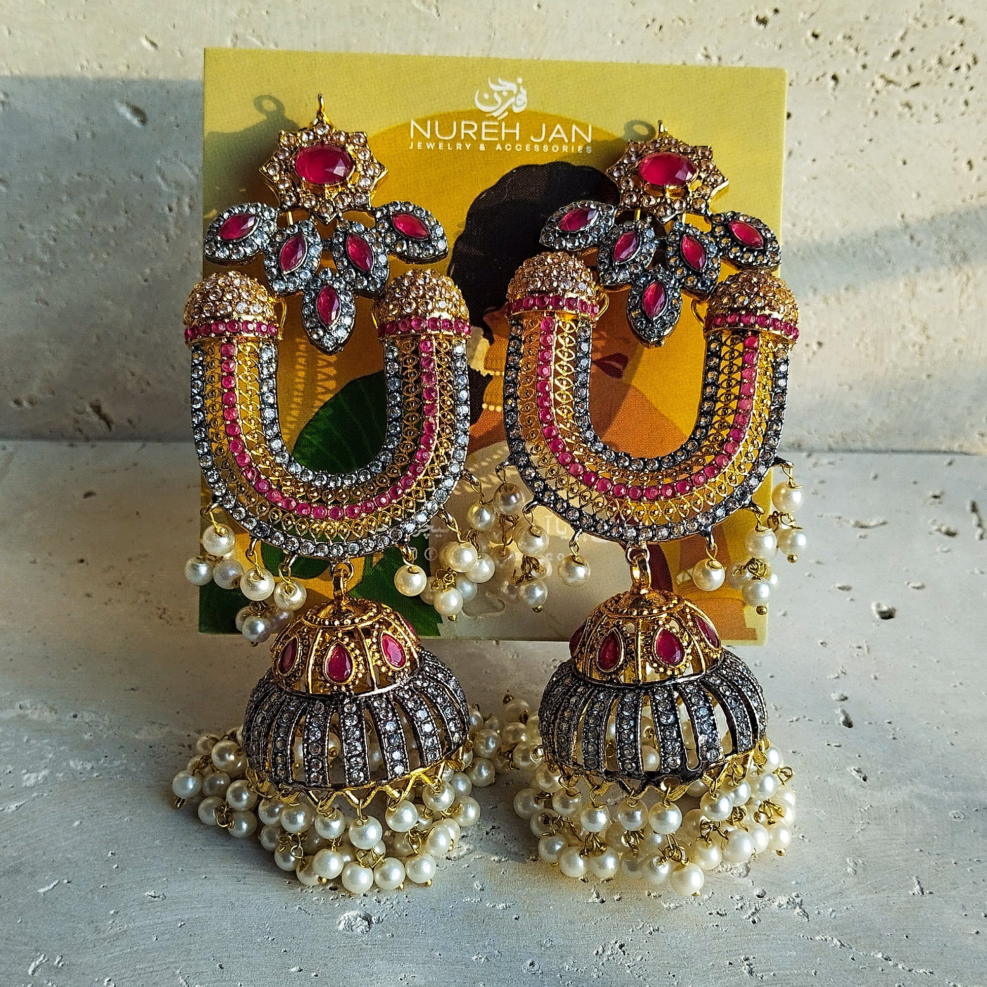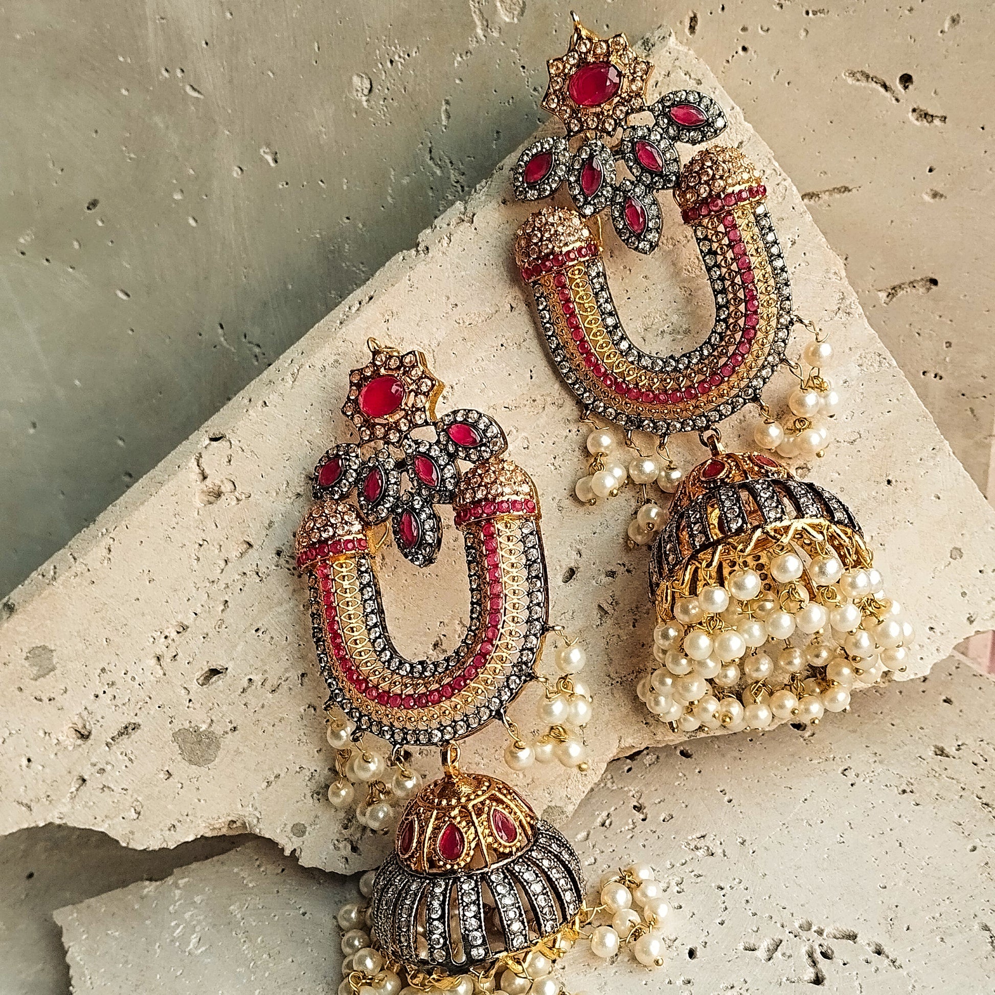 A crown of floral stones sprawls like a meticulously arranged mehndi tray at a dholki, perched atop a bold U-shaped frame reminiscent of Persian archways—because why settle for basic when you can channel empire aesthetics? Below, a jhumka sways with the effortless charm of a courtesan who knows she runs the court better than the king. Dangling pearls glisten like Safavid chandeliers, or like unsolicited investment advice in a family WhatsApp group. Gulzār—for those who understand that true power is never loud, just beautifully adorned and slightly intimidating.