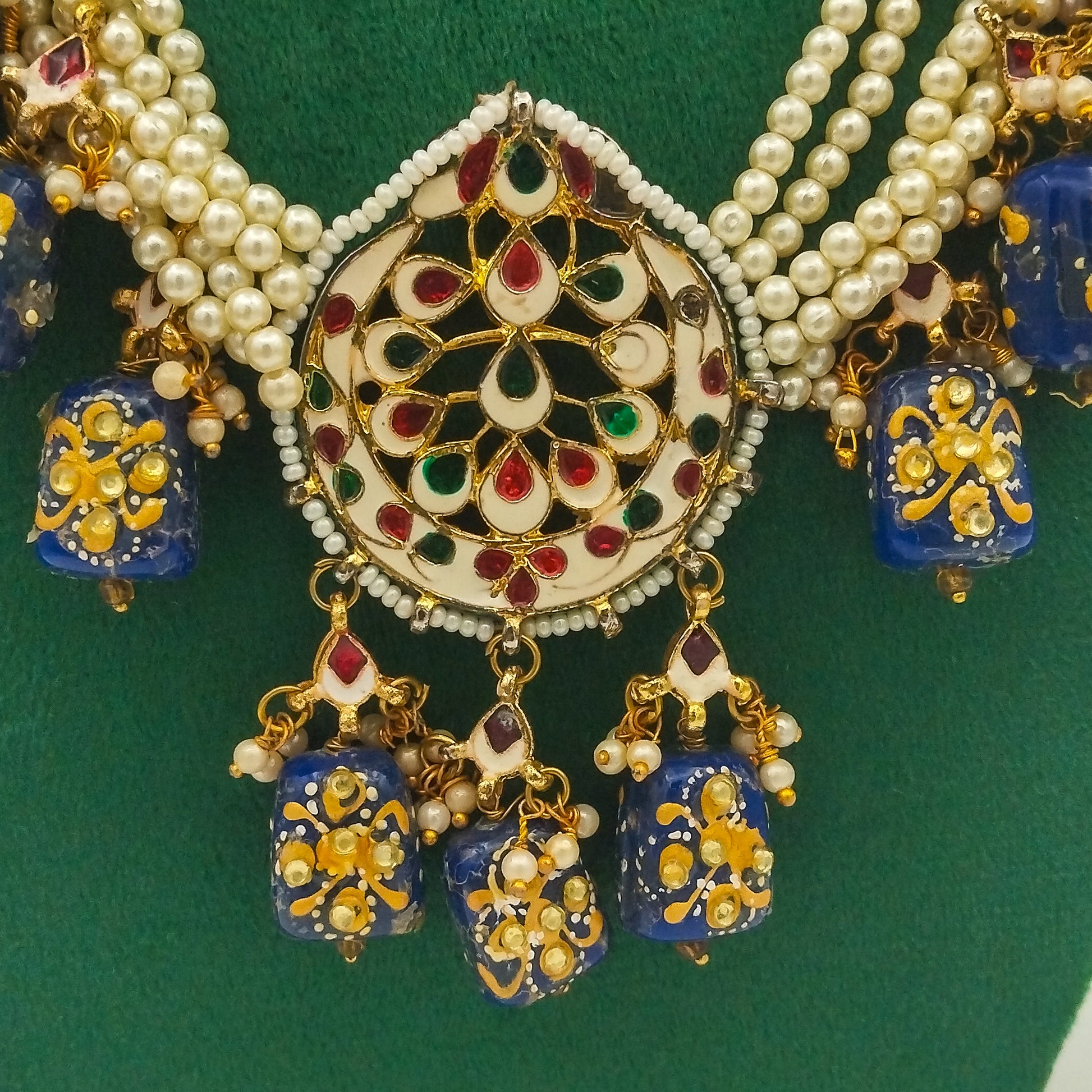 A hand-painted Indian made choker set drenched in royal colors — blue stones, red and green accents, and pearls that whisper Mughal charm. Crafted for festive nights that call for timeless elegance.