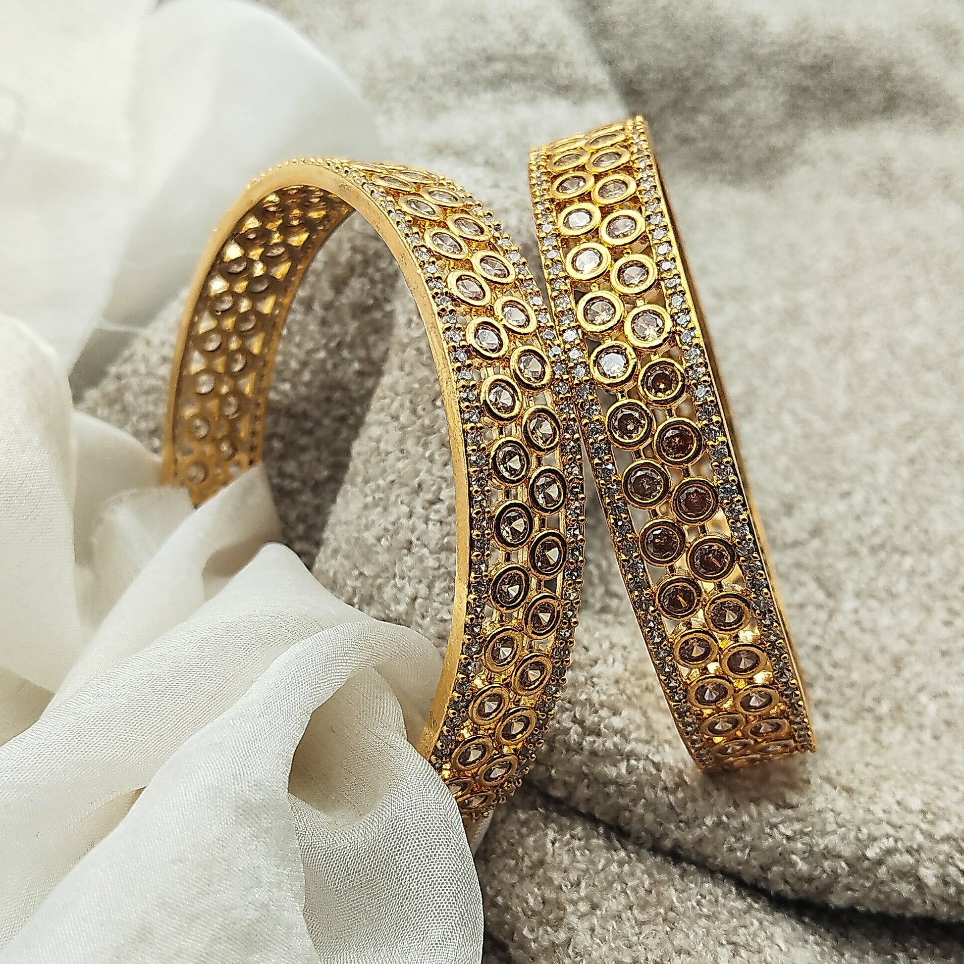 Medium-thick golden bangles speckled with round stones—like coins slipping into the hands of a well-placed vizier. Zar-Gosh isn’t just jewelry; it’s an ode to the fine art of well-timed diplomacy, from the Mughal darbar to the family dawat where Phuppo’s gaze lingers a little too long on your left hand. Just like history’s greatest deals, some things are better settled in hushed tones and sparkling distractions. And if the emperor could sign off an entire province for a well-worded flattery, you can definitely win an argument with a well-placed wrist flick.