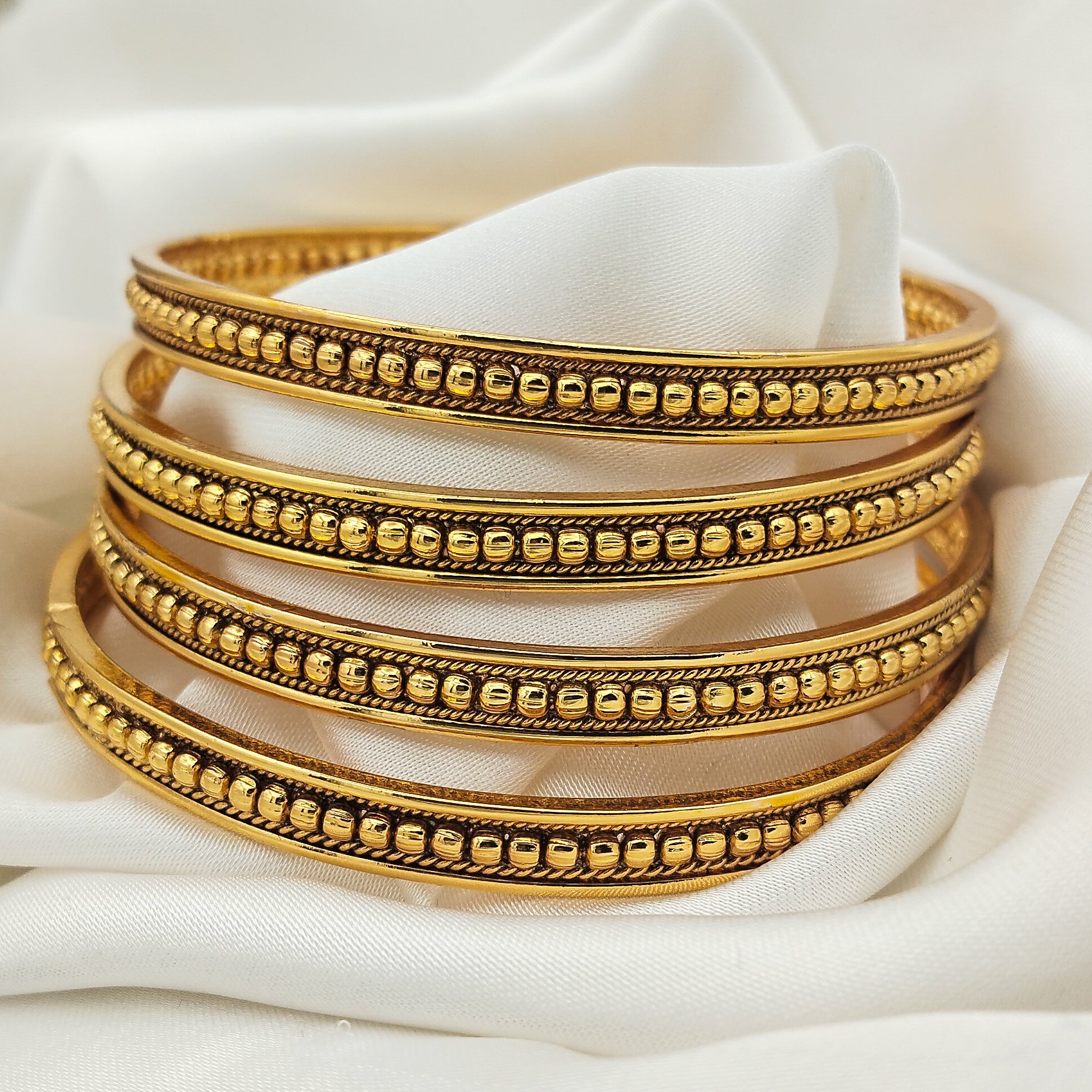 This set of 4 gold-plated bangles are crafted to mirror the warmth and sheen of real gold. Minimal yet radiant, they’re perfect to wear solo or layered with your favorite chooriyan. A graceful essential that blends seamlessly into both everyday elegance and festive flair.