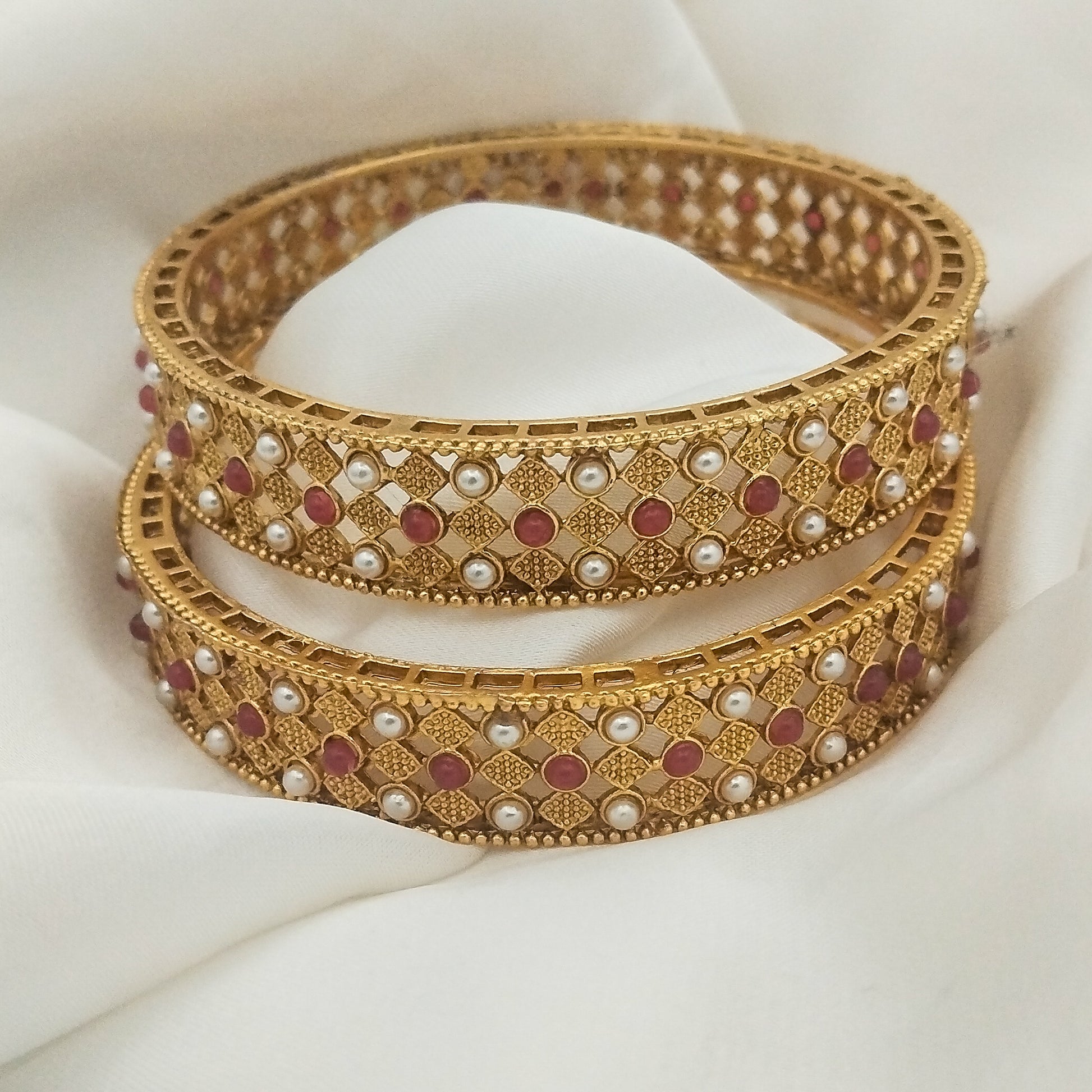 Golden bangles adorned with tiny white and red pearls — Zarmeher embodies warmth, radiance, and royal charm. Each curve reflects the brilliance of sunlight dancing on pure gold, made for those who carry their own light.